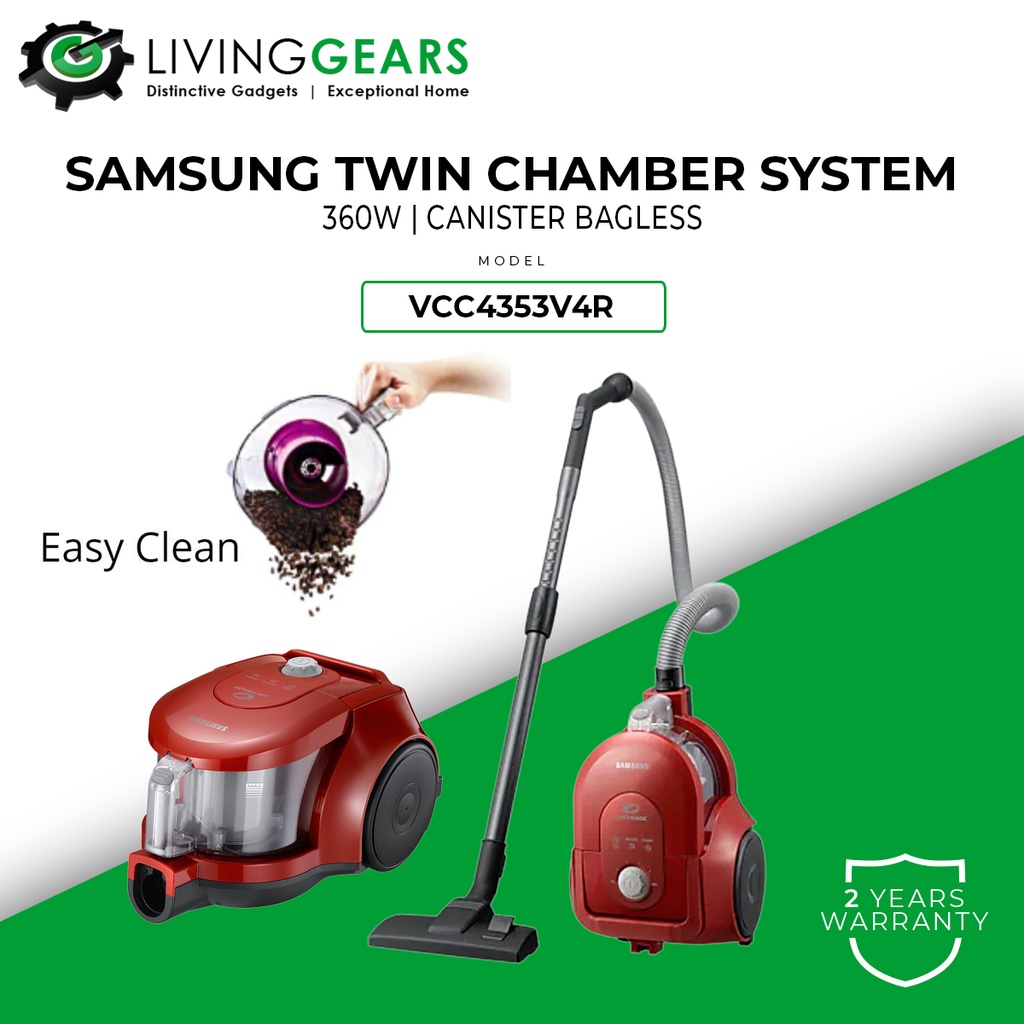 Samsung Twin Chamber System Bagless Canister Vacuum Cleaner (360W Samsung 1800W Twin Chamber System Bagless Canister Vacuum Cleaner Vcc4353V4R Canister bagless with twin chamber system, 360w. samsung bagless vacuum vcc4353v4r/xme 1800w. Two compartments chambers to divides dirts for improved cleaning. samsung 1800w canister bagless with twin chamber system vcc4353v4r/xme. — twin chamber system: Two compartments chambers to divides dirts for improved cleaning. 2 years samsung malaysia warranty. Can hold 1.3 liters of dust and dirt, clean.. Samsung 1800W Twin Chamber System Bagless Canister Vacuum Cleaner Vcc4353V4R.